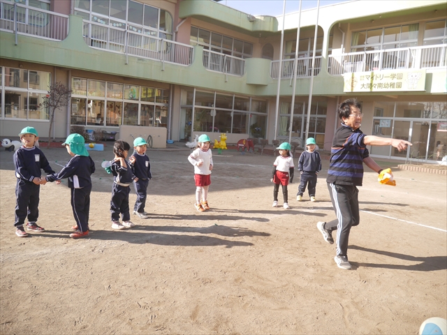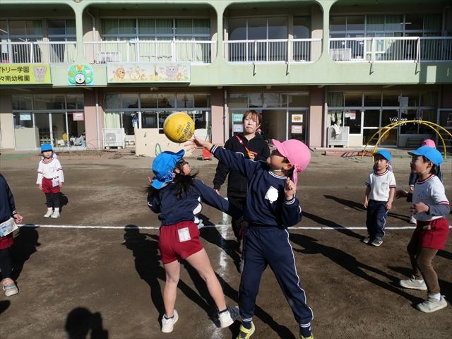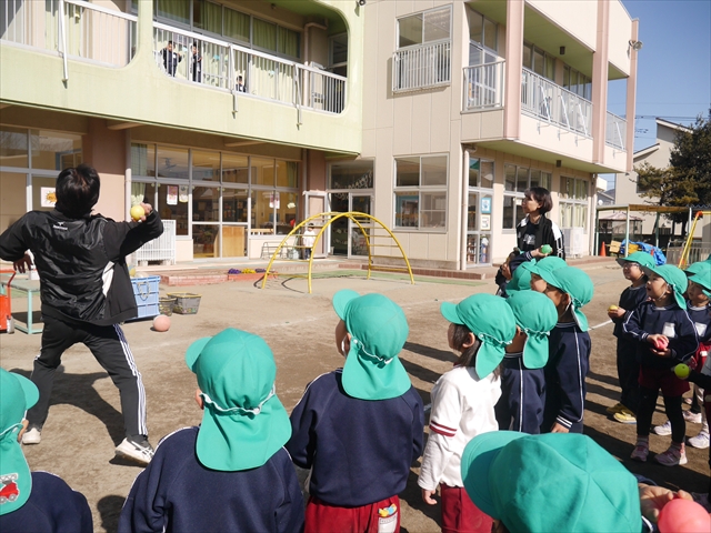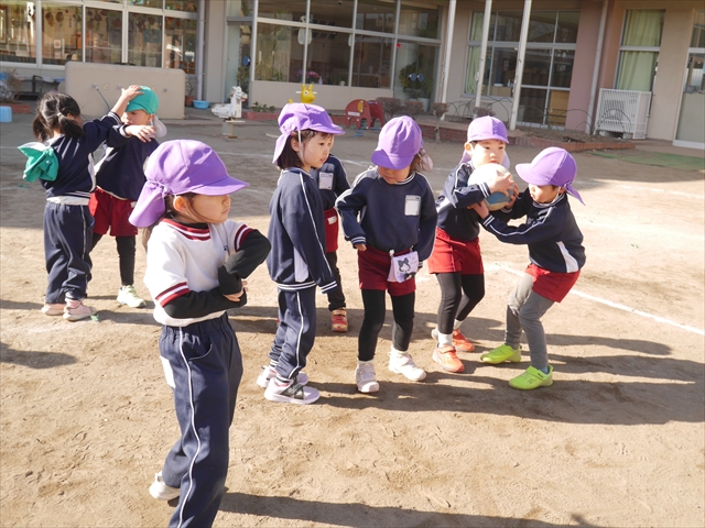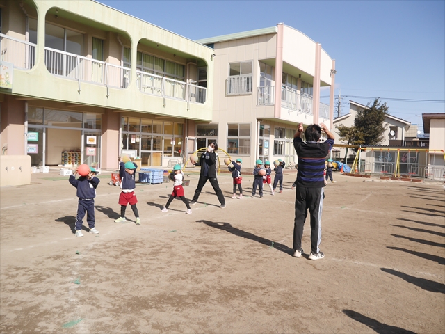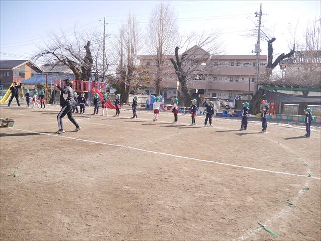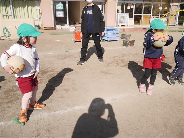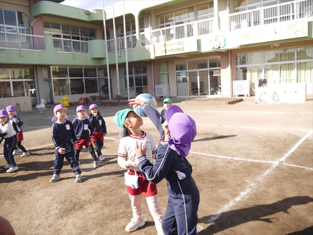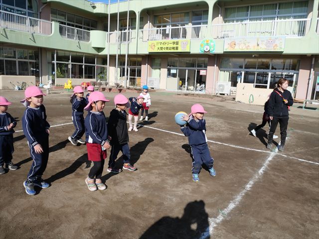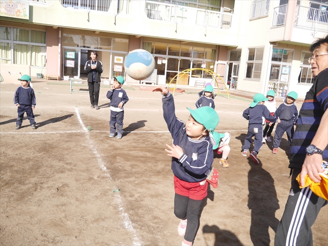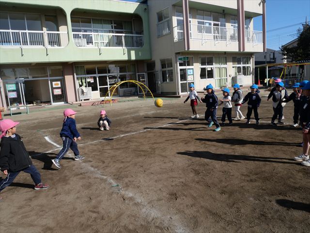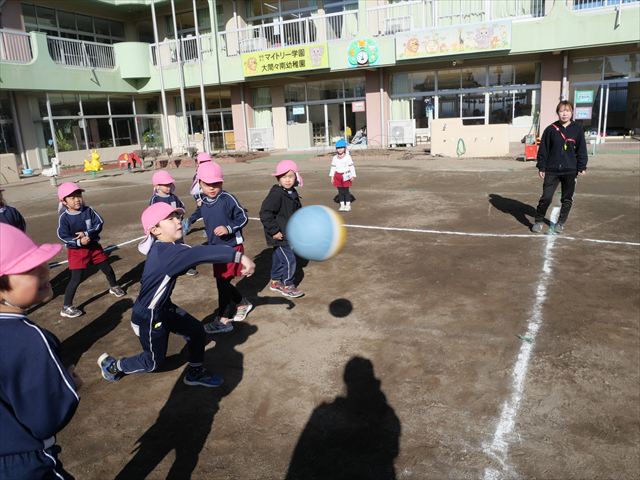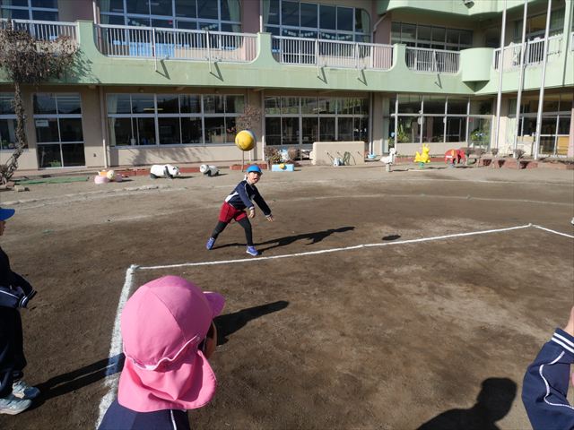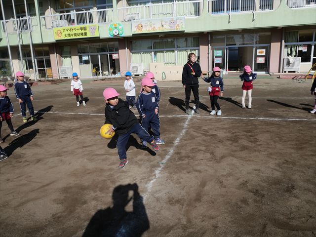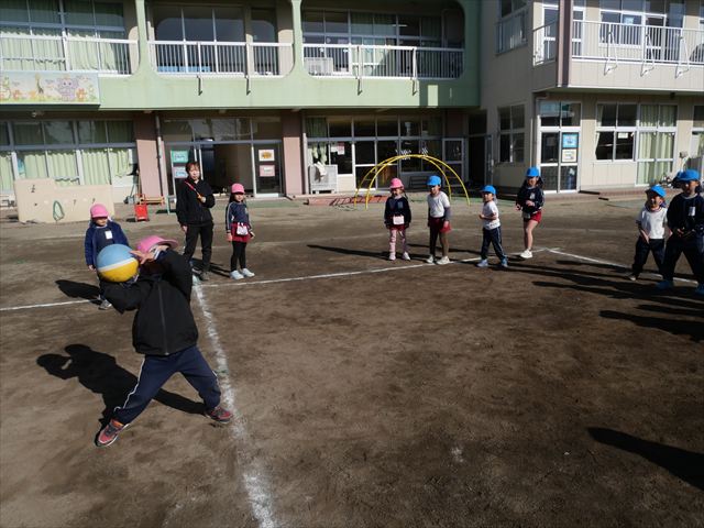 午後は、園長先生指導によるドッジボール教室に参加しました。まず「ドッジボールとは!」①ボールを投げて相手に当てなければいけない②当てるためにはボールを取らなければいけないと説明を受けて、今日はボールをなるべく遠くまで投げる練習を主に行いました。みんなで一斉に投げたり、テストだぞ!と一人ずつ投げたりすることで子どもたちは「よし、頑張るぞ!」と楽しみながらも闘志を燃やし頑張っていたように思います。ゴムボールを使った練習から始め途中ドッジボールに変えていきました。大きさが変わっただけでボールの投げ方は一緒だよ!と何回も投げていきました。後半はさくらvsつつじで実戦していきました。子どもたちも先生たちも熱くなり盛り上がり、初めてにしてはいい戦いとなりました。子どもたちからは「楽しかった!またやりたい!」との声が。 園長先生ありがとうございました。