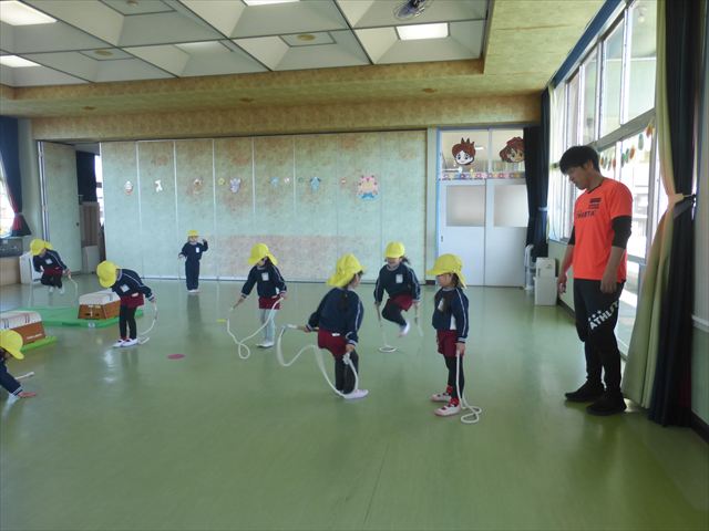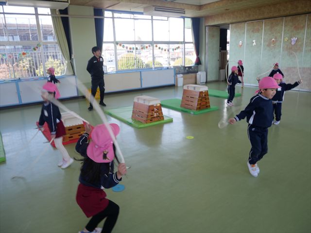 今日は、運動教室を行いました。今日は、側転、逆上がり、なわとびをしました(^O^)真剣に参加することができました。前跳び連続10回跳べるようになった子もいました(^^)/毎日コツコツ練習を頑張りたいと思います。その後は、しりとりに挑戦しました。たくさん言葉を発表してくれる子もいました。午後は、リズム遊びとしてお友だちとリズム打ちをしました。