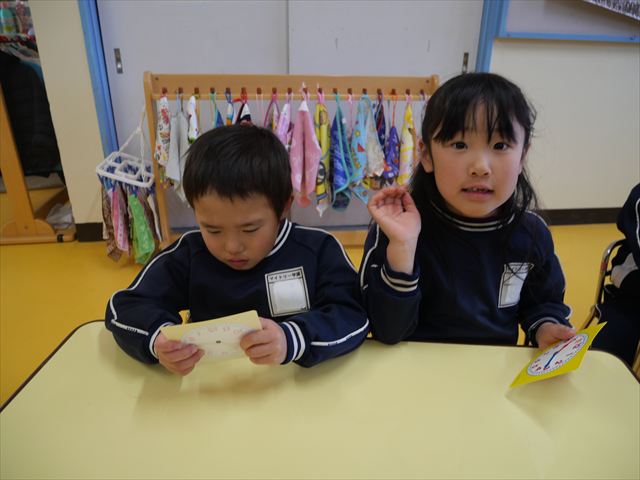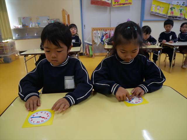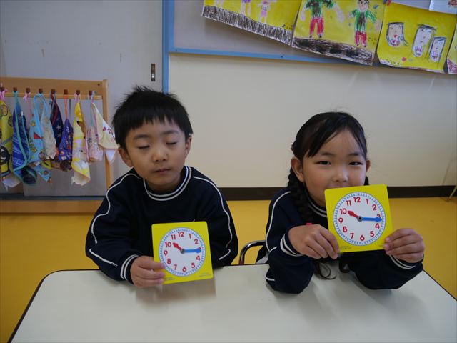 合間は算数の時間で時計をしました。◯時はほとんどの子が分かるようになってきたので、◯時◯分を読めるようにクイズ形式で取り組みました。小学校に行くと今よりもさらに時間を見て行動することが増えるので、少しでも読めるようになってほしいなと思います。※うみ組の写真がなくて申し訳ありません。m(_ _)m