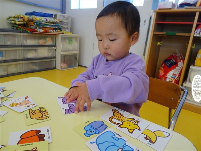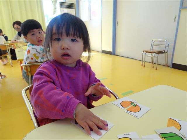 満2歳児さんは、絵合わせ遊びをしました。表裏に絵が描いてあり、2枚合わせて一つの絵になるカードで、食べ物や動物、乗り物を作りました。上下左右をよく確認して、絵が完成するように頑張っていました!見事完成すると、ニコニコでとても嬉しそうな満2歳児さんでした(
