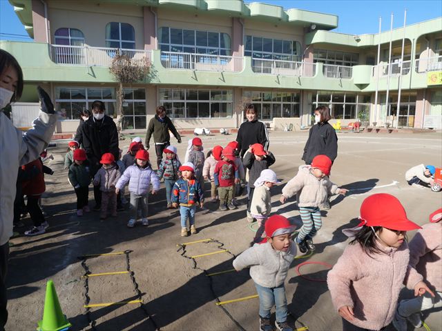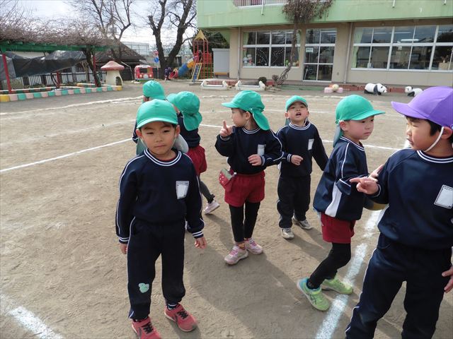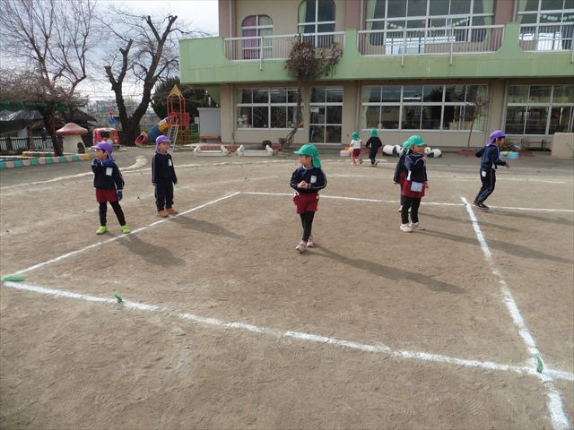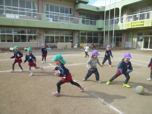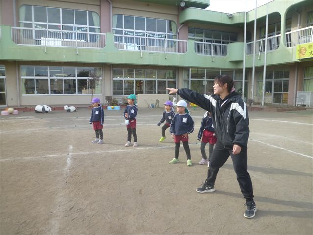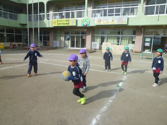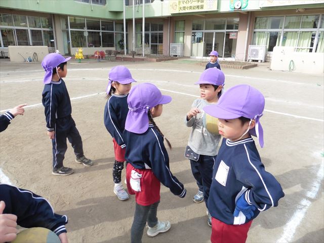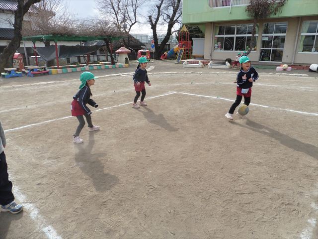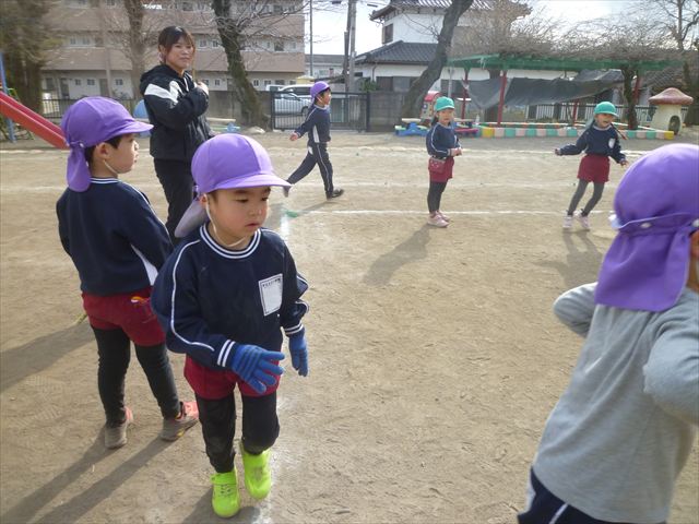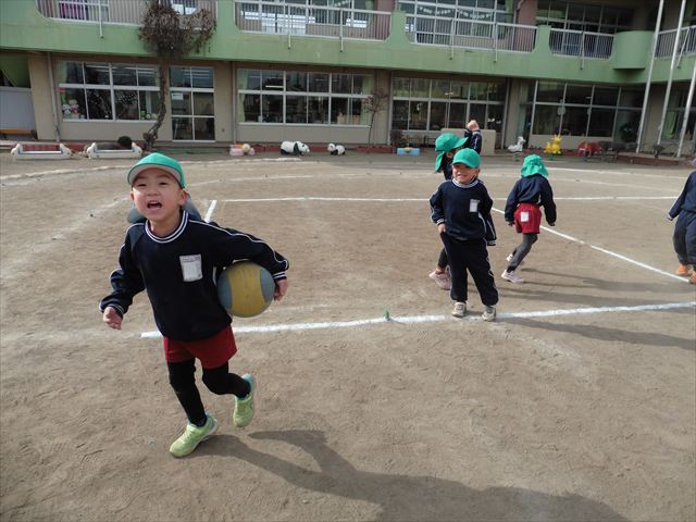 午後は、戸外遊びをしました。安全に遊べるようお約束をした後、園庭にある遊具で自由に遊びました♪また、昨日のドッジボール教室がとても楽しかったようで、コートを引くと「ドッジボールしよう!」「チームはどうする?」など、ワクワクしながら駆け寄る子どもたち。ルールを復習しながらとても楽しそうに遊んでいました☆寒さに負けず元気いっぱいな子どもたちでした!