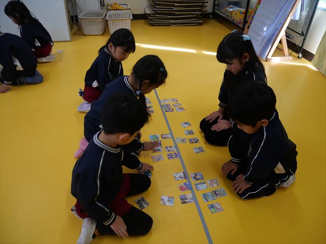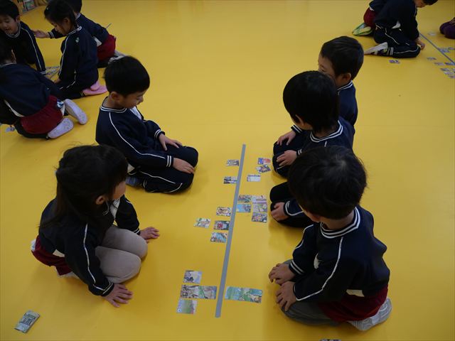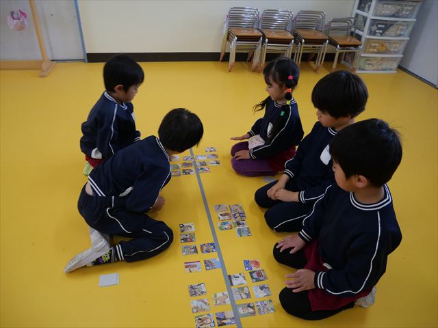 今年度から、新たに月に1回「主体性の時間」(主体的学び・遊びの時間〈室内・戸外〉)のカリキュラムを取り入れました。これは、園児の主体性を重視し、学年・担任が意図したねらい・環境構成の中、子どもたちがやりたい「学び」「遊び」を好きにやる時間です。子どもたちが能動的にその活動を通して学んでいき、自ら考え、【見通し】(何をするのか?何をして遊ぶのか?何を作るのか?)を立て、自ら活動していく力を養っていきたいと思います。 今日は、カード遊びをしました\(^o^)/