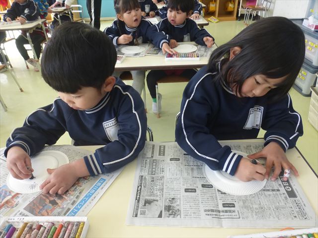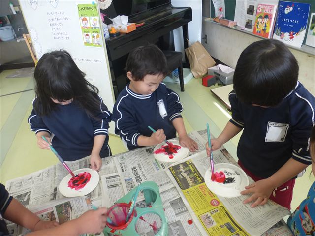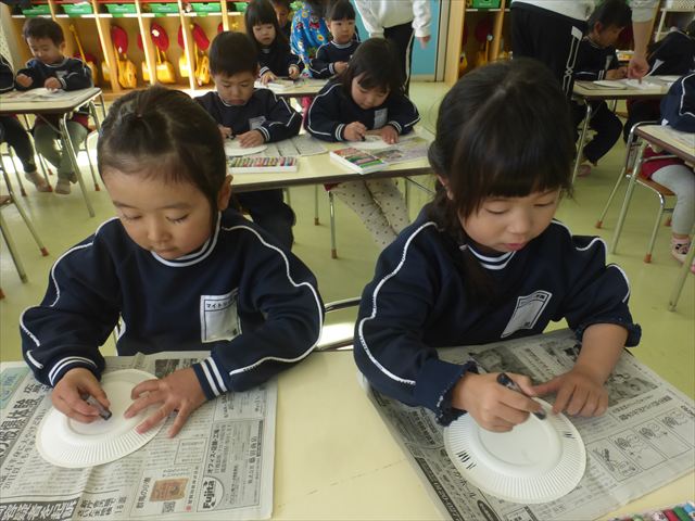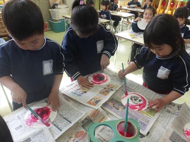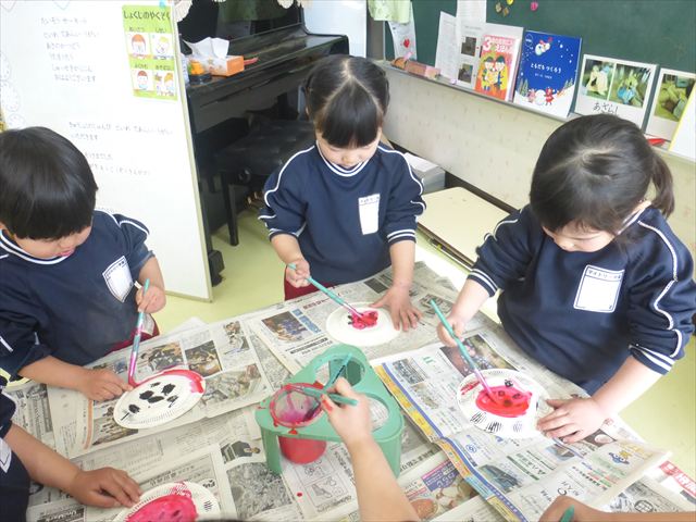 今日は今年度最後のダンス教室がありました。詳しくはダンス教室の記事をご覧ください。その後はホール飾り作りをしました。今回の年少さんの担当はてんとう虫。まず製作①として黒で丸い模様を描いてその上から赤い絵の具を塗ってはじき絵をしました。うわ〜すごい。と楽しむお友だちでした。午後は、算数の時間としてイラストと数字を合わせてお勉強しました。