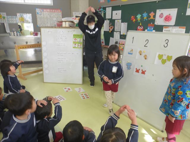 そして、満3歳児さんはかるたをしました。まず、かるたのルールとそれぞれの札がなんのイラストなのかを確認してから始めました。取る時は「はい!」って取るんだよと伝えましたが、取るのにとにかく必死でそれどころではないお友だち(笑)腕を一生懸命伸ばして取っていました!札が分かっていても、躊躇してしまってなかなか手が出ない子もいたので、繰り返し練習していこうと思います(^^)/