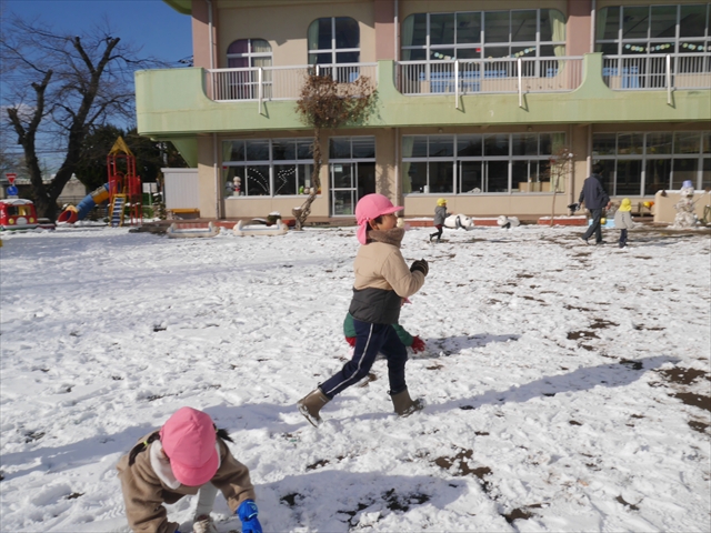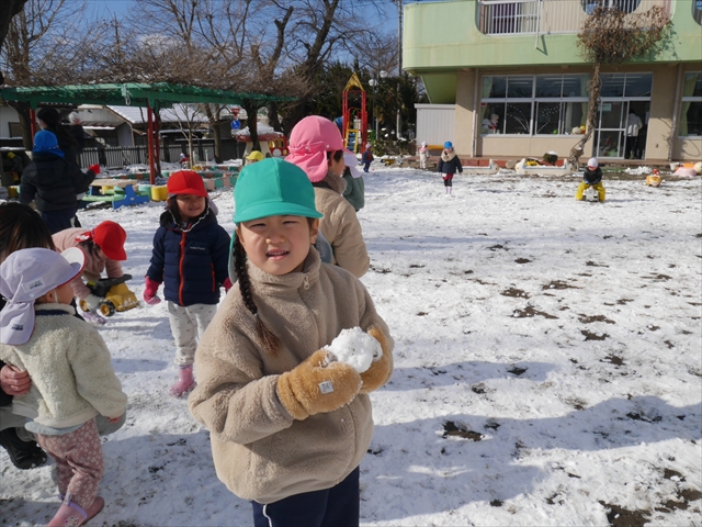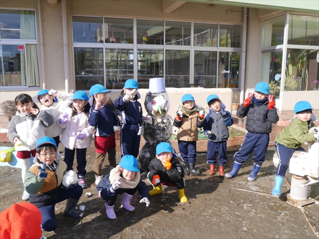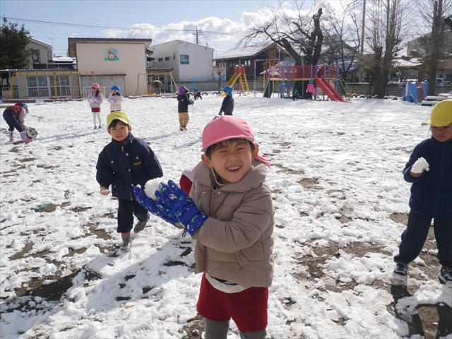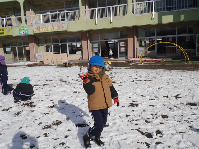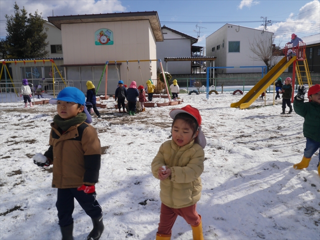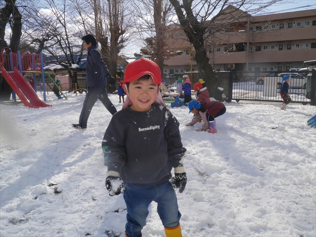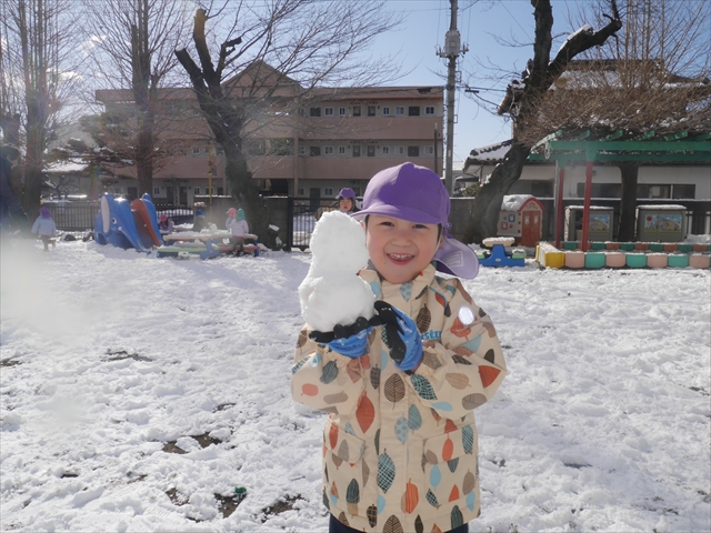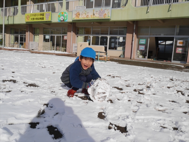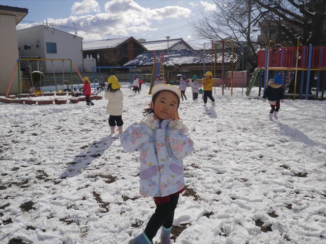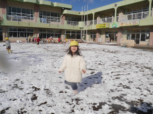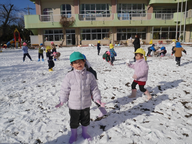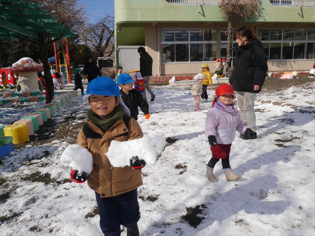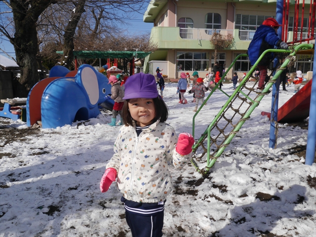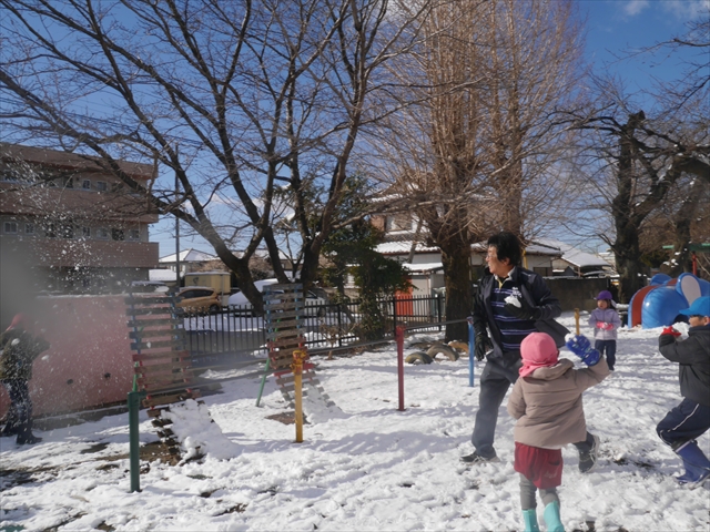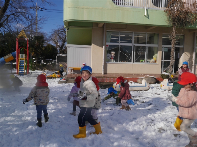 昨日は深夜から朝にかけて、群馬でも大雪となりました!大間々町は、15cmほど積もったようです。夕刻にはほぼ道路の雪は溶けてしまいましたが、マイトリーの園庭は雪原状態でした。そこに、今日の深夜また雪が降ったので、園庭は絶好の雪遊び場となりました。今日は朝登園してきた子から、どんどん「雪遊び」「雪合戦」をし、子どもたちは今年初めての「雪」を、手が冷たくなったのも我慢して存分に楽しみました!園長先生が園庭に「かわいくない?似てないオラフ(雪だるま)」を作ったので、記念写真も撮ったりして楽しみました!(*^_^*) 10時半頃には園庭の雪も大分溶けてしまいましたが、朝の活動から午前のカリキュラムは、ずっと楽しい「雪遊び」「雪合戦」となり、大いに楽しみました。(^_^)b \(^_^)/