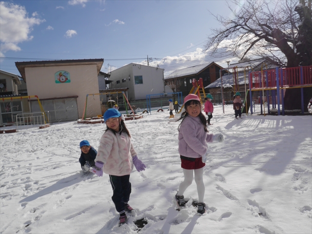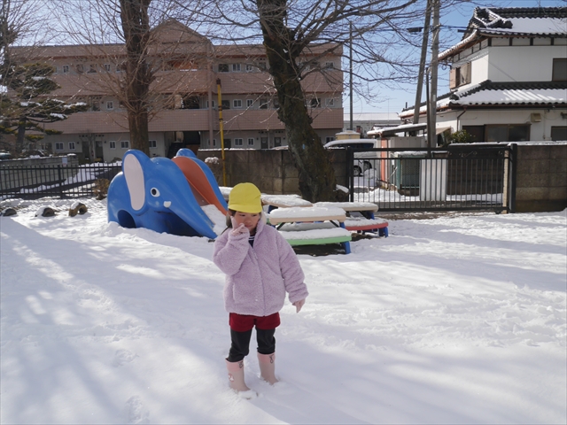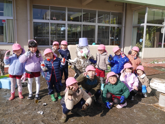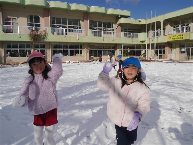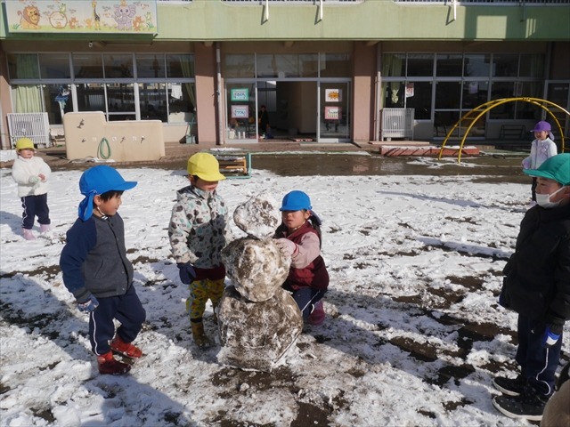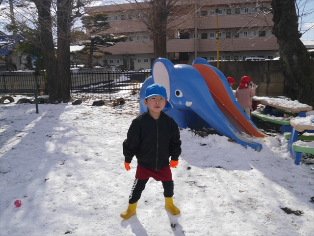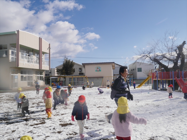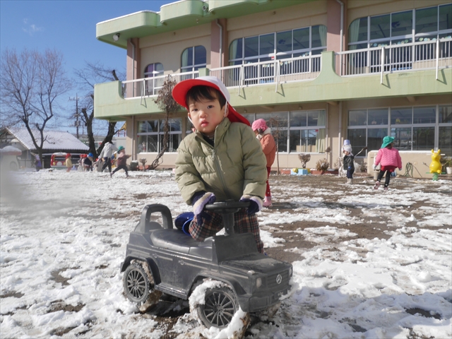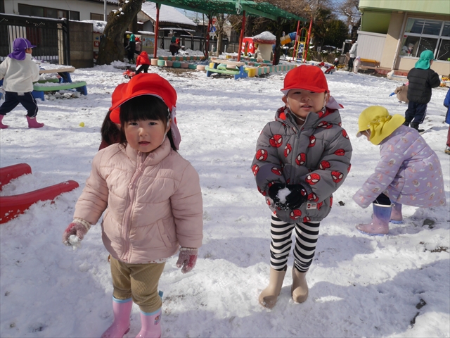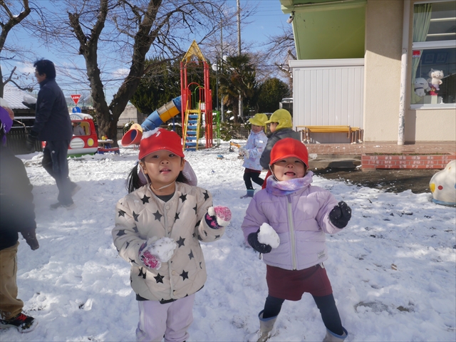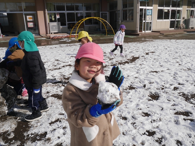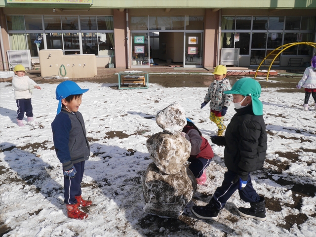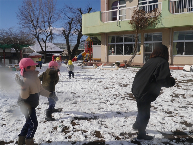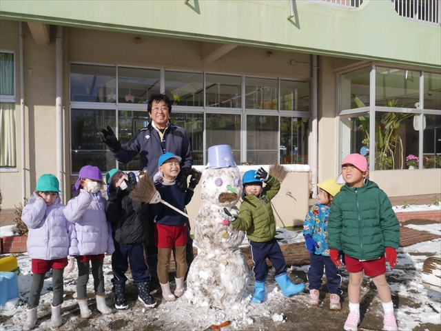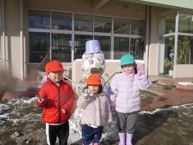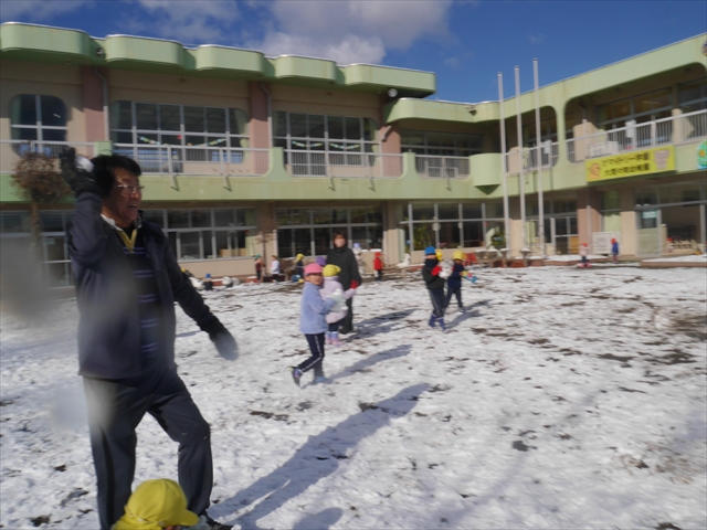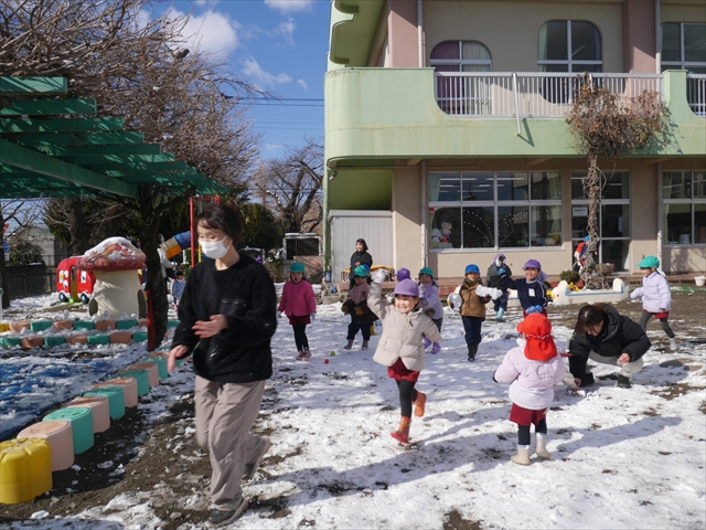 昨日は深夜から朝にかけて、群馬でも大雪となりました!大間々町は、15cmほど積もったようです。夕刻にはほぼ道路の雪は溶けてしまいましたが、マイトリーの園庭は雪原状態でした。そこに、今日の深夜また雪が降ったので、園庭は絶好の雪遊び場となりました。今日は朝登園してきた子から、どんどん「雪遊び」「雪合戦」をし、子どもたちは今年初めての「雪」を、手が冷たくなったのも我慢して存分に楽しみました!園長先生が園庭に「かわいくない?似てないオラフ(雪だるま)」を作ったので、記念写真も撮ったりして楽しみました!(*^_^*) 10時半頃には園庭の雪も大分溶けてしまいましたが、朝の活動から午前のカリキュラムは、ずっと楽しい「雪遊び」「雪合戦」となり、大いに楽しみました。(^_^)b \(^_^)/