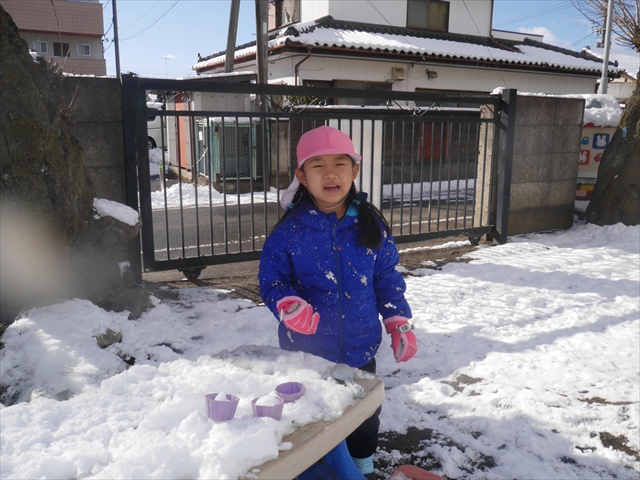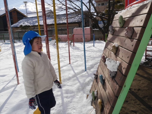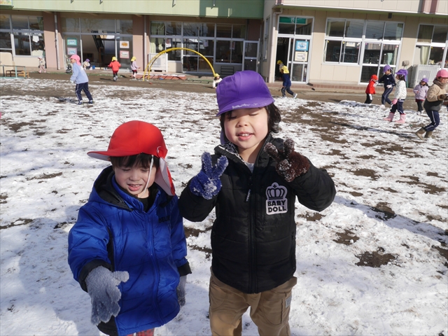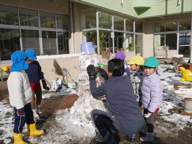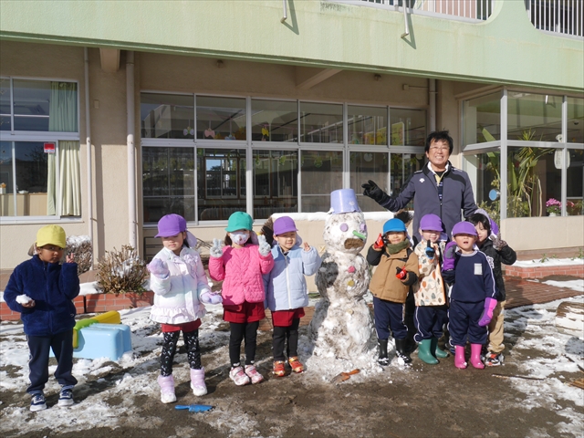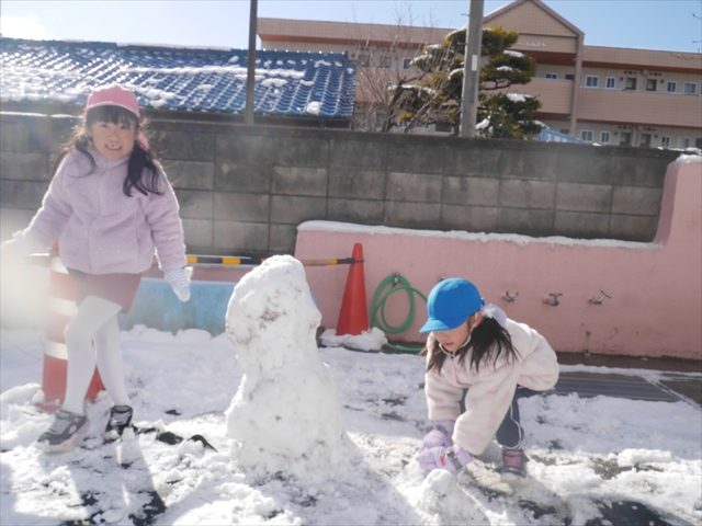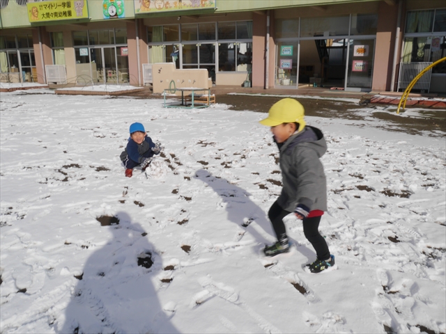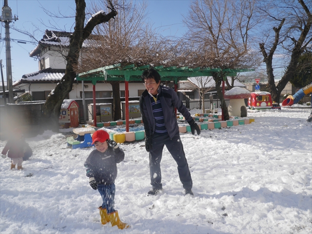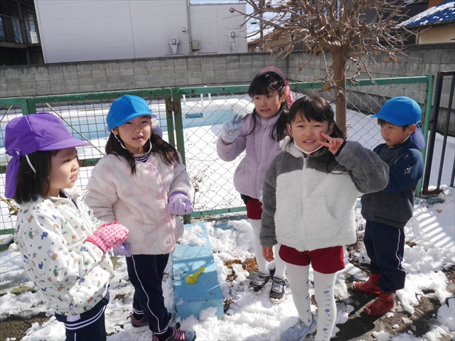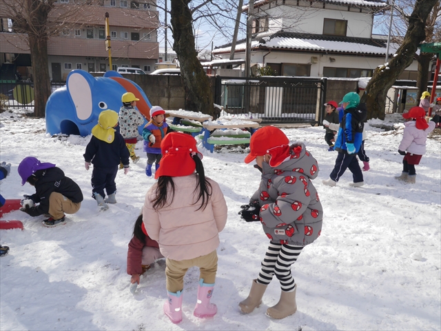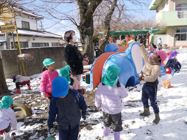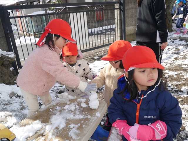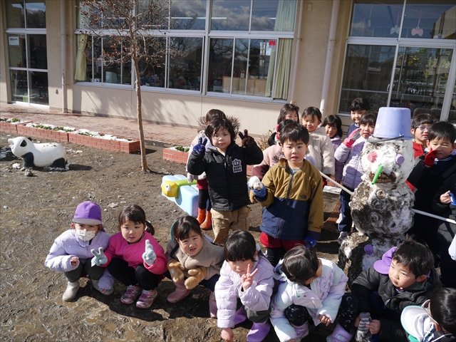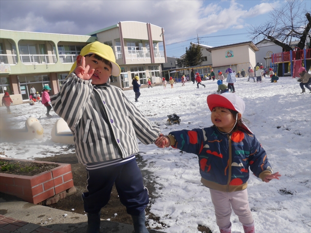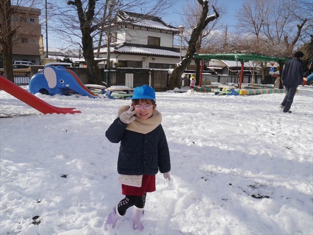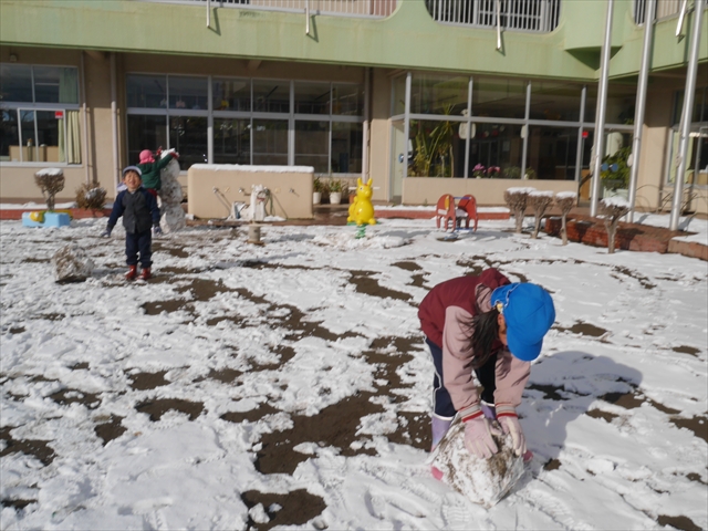 昨日は深夜から朝にかけて、群馬でも大雪となりました!大間々町は、15cmほど積もったようです。夕刻にはほぼ道路の雪は溶けてしまいましたが、マイトリーの園庭は雪原状態でした。そこに、今日の深夜また雪が降ったので、園庭は絶好の雪遊び場となりました。今日は朝登園してきた子から、どんどん「雪遊び」「雪合戦」をし、子どもたちは今年初めての「雪」を、手が冷たくなったのも我慢して存分に楽しみました!園長先生が園庭に「かわいくない?似てないオラフ(雪だるま)」を作ったので、記念写真も撮ったりして楽しみました!(*^_^*) 10時半頃には園庭の雪も大分溶けてしまいましたが、朝の活動から午前のカリキュラムは、ずっと楽しい「雪遊び」「雪合戦」となり、大いに楽しみました。(^_^)b \(^_^)/