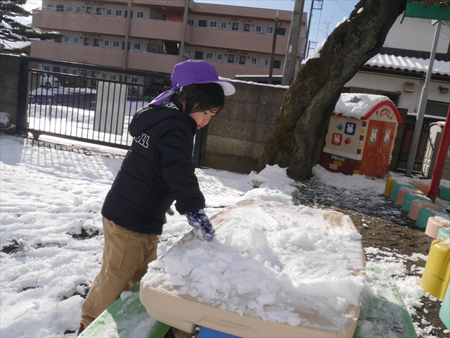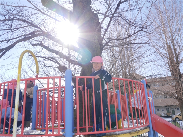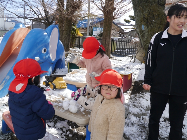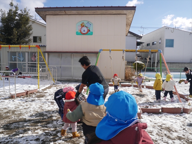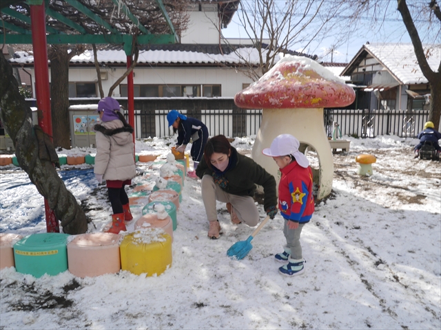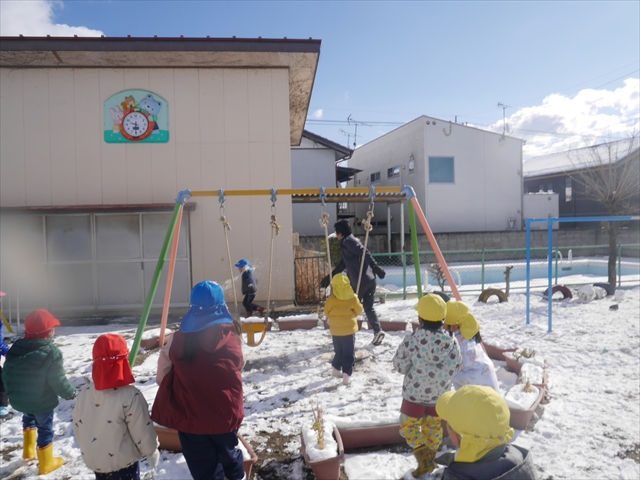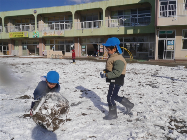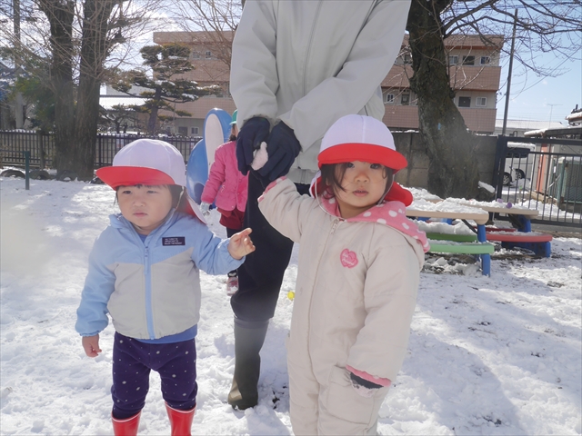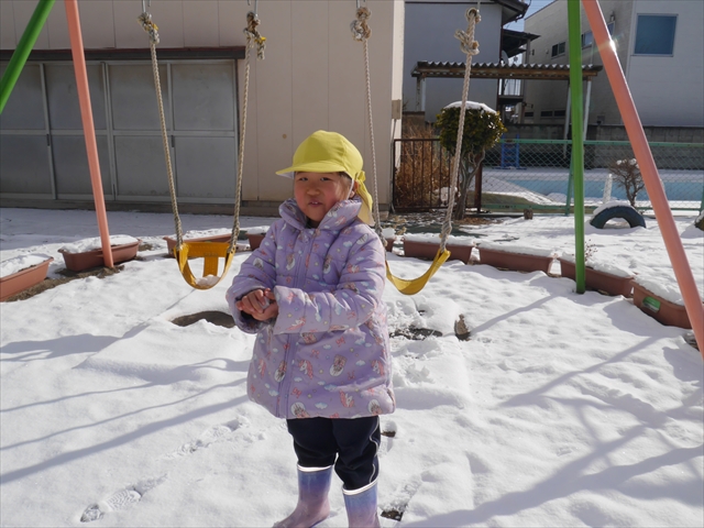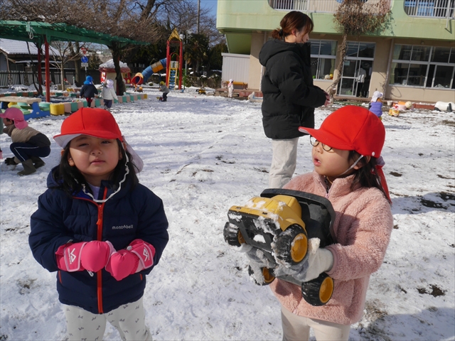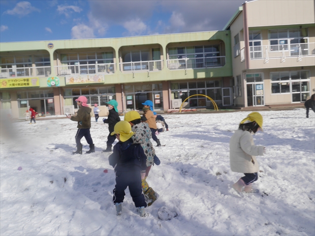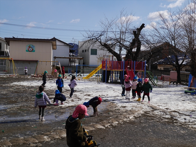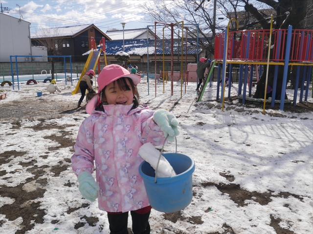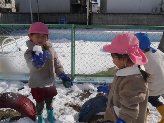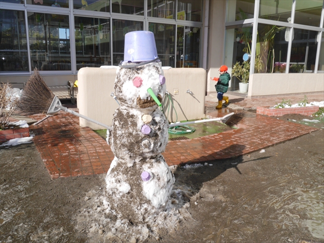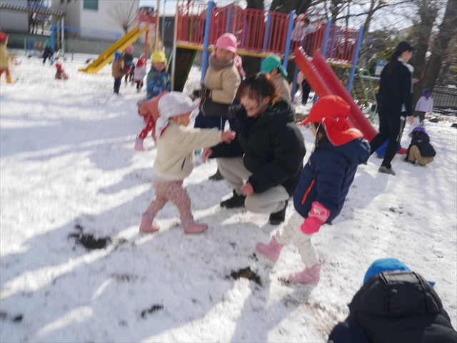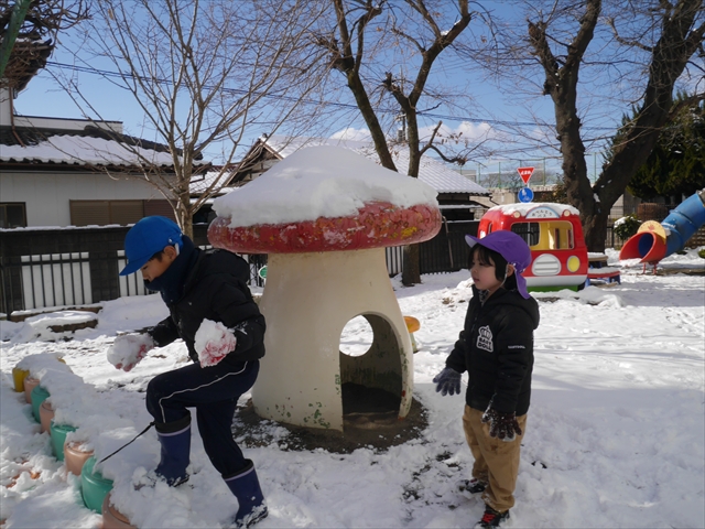 昨日は深夜から朝にかけて、群馬でも大雪となりました!大間々町は、15cmほど積もったようです。夕刻にはほぼ道路の雪は溶けてしまいましたが、マイトリーの園庭は雪原状態でした。そこに、今日の深夜また雪が降ったので、園庭は絶好の雪遊び場となりました。今日は朝登園してきた子から、どんどん「雪遊び」「雪合戦」をし、子どもたちは今年初めての「雪」を、手が冷たくなったのも我慢して存分に楽しみました!園長先生が園庭に「かわいくない?似てないオラフ(雪だるま)」を作ったので、記念写真も撮ったりして楽しみました!(*^_^*) 10時半頃には園庭の雪も大分溶けてしまいましたが、朝の活動から午前のカリキュラムは、ずっと楽しい「雪遊び」「雪合戦」となり、大いに楽しみました。(^_^)b \(^_^)/