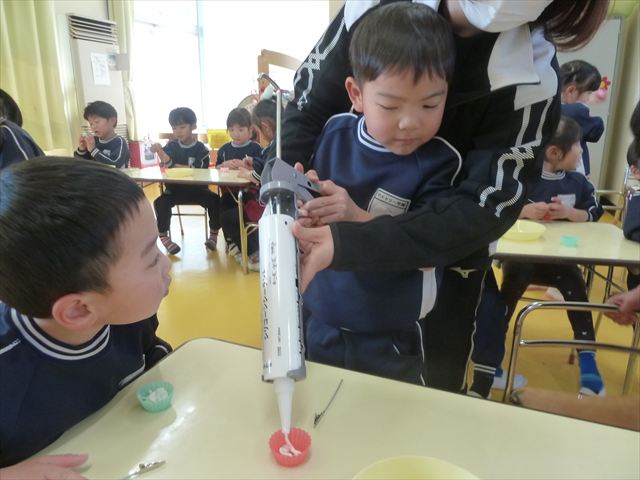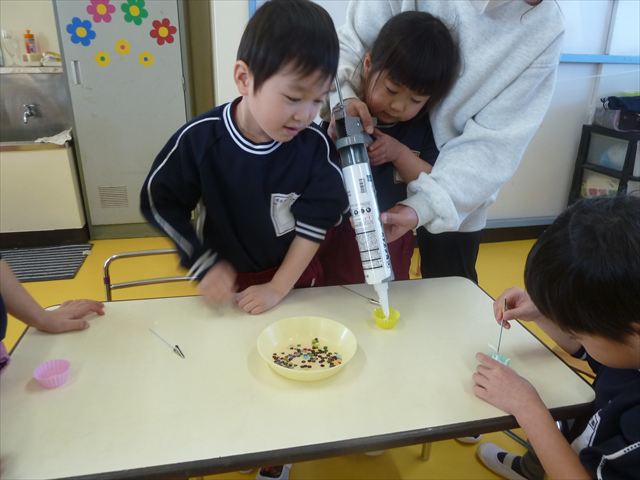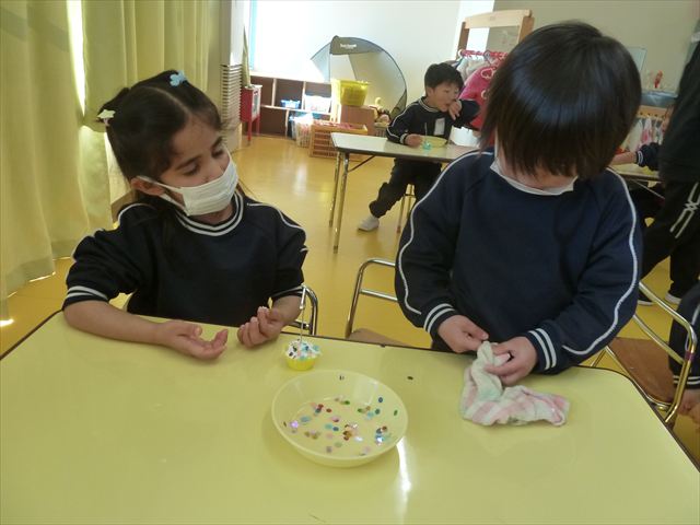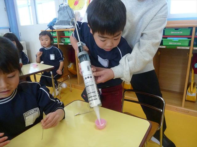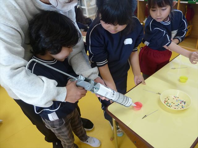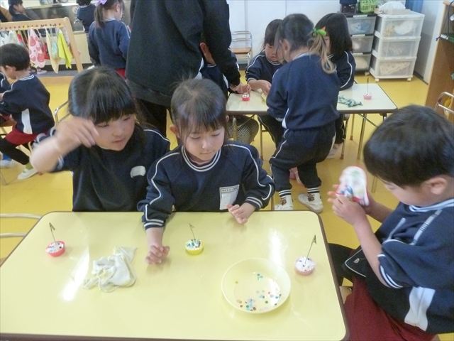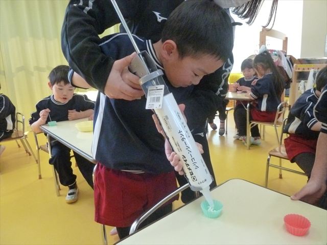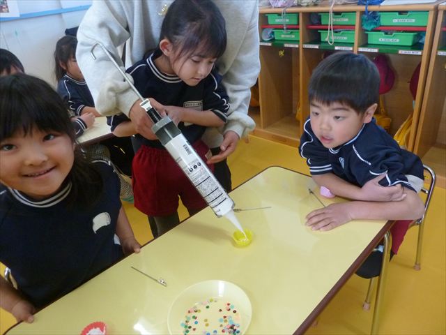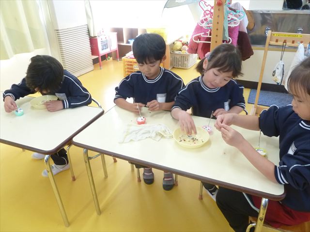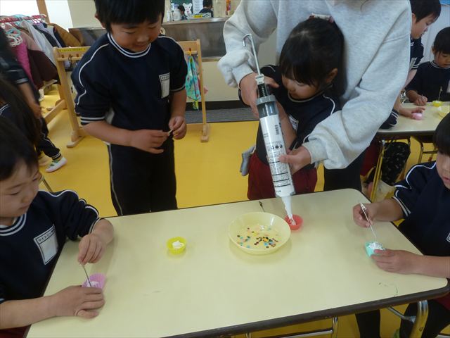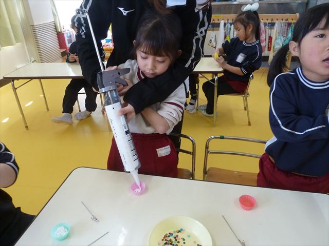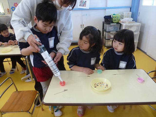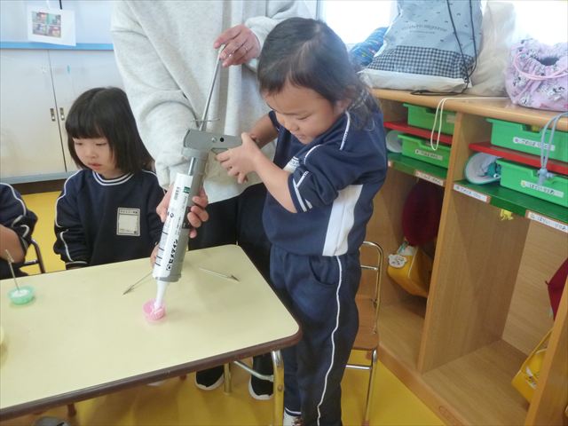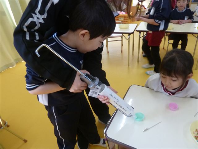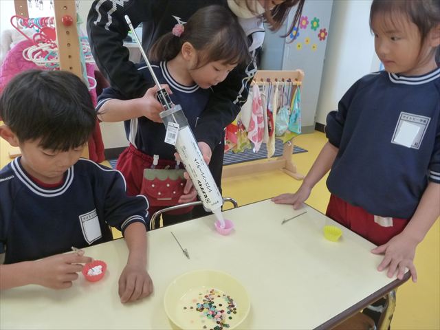 今日は、年長さんへのプレゼント「卓上クリップ」作りをしました。ホームセンターで売っている目地どめ用コーキングをお弁当おかずカップに絞って、クリップを刺し飾り付けをして作りました。子ども達は、初めての材料にわくわく、そして少し緊張しながら、カップに絞っていました。可愛らしい卓上クリップが出来上がりました。乾いたらラッピングをして年長さんに渡すのが楽しみです♡