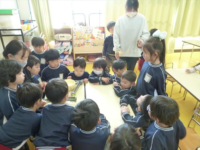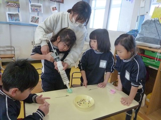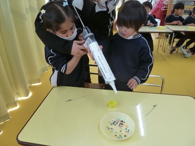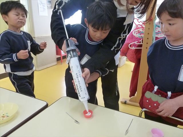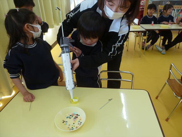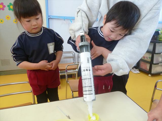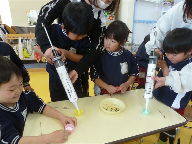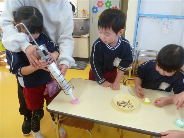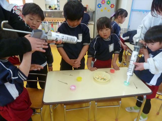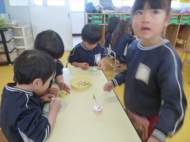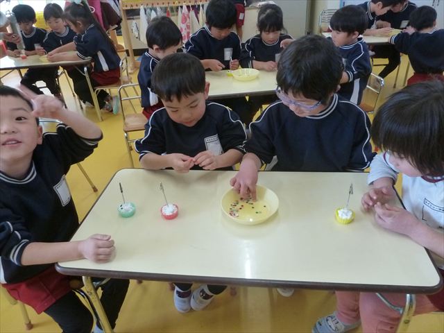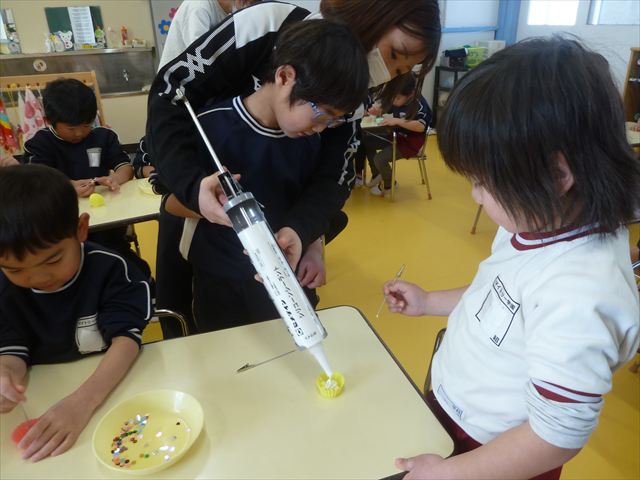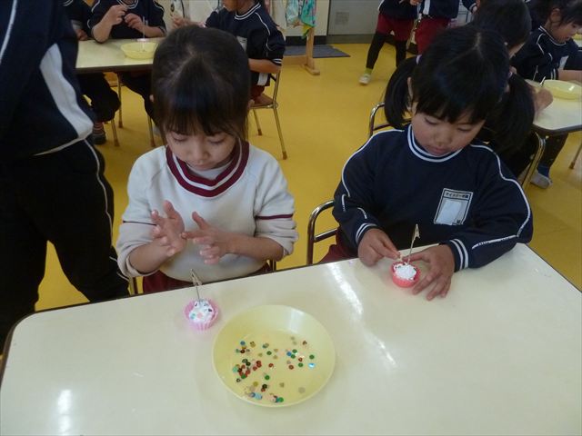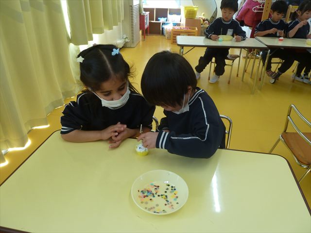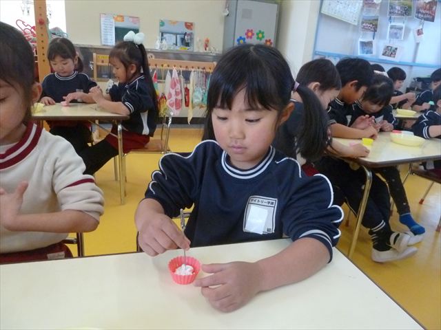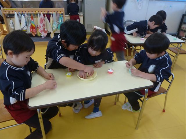 今日は、年長さんへのプレゼント「卓上クリップ」作りをしました。ホームセンターで売っている目地どめ用コーキングをお弁当おかずカップに絞って、クリップを刺し飾り付けをして作りました。子ども達は、初めての材料にわくわく、そして少し緊張しながら、カップに絞っていました。可愛らしい卓上クリップが出来上がりました。乾いたらラッピングをして年長さんに渡すのが楽しみです♡
