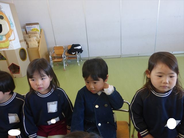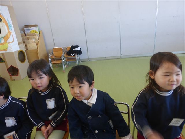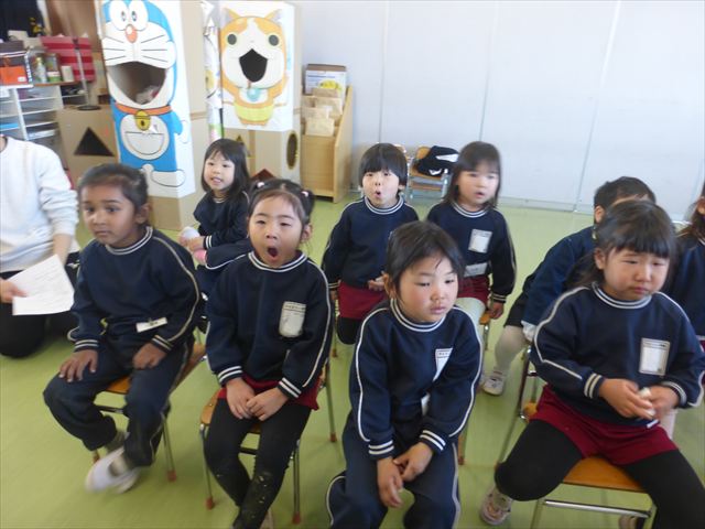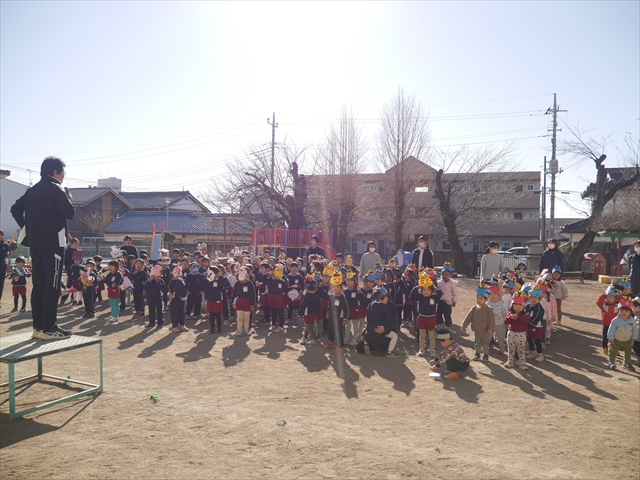 ※明日は神明宮節分祭に参加します。制服登園です。送迎の方は9時までに登園してください。園からバスで出発して、10:00から豆まき開始となります。見学されたい方は直接神明宮に来ていただき、一緒にお菓子を取って参加してください。またお菓子を取る用に大きい手提げやバックがあれば持たせてください。よろしくお願いいたします。今日は、朝礼で園長先生から「立春」と「節分」の話があり、「これから日本は、寒い日がどんどん続くようになったり、雪が降るようになったりするけど、立春を過ぎるといろいろな場所や園庭のどこかに着実に春がやって来ているから、春を見つけて楽しんでください。」と話がありました。その後、今日から新しくマイトリーの仲間になったお友達3人を紹介しました。みんな仲良くして下さい。(^_^)v ヘ(^o^)/